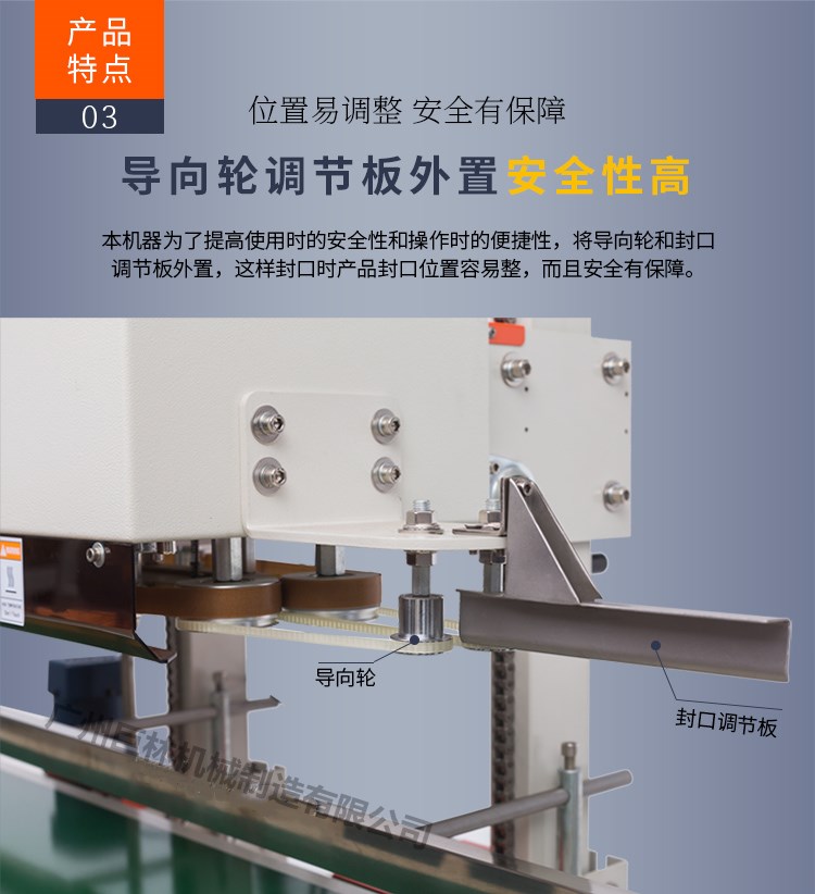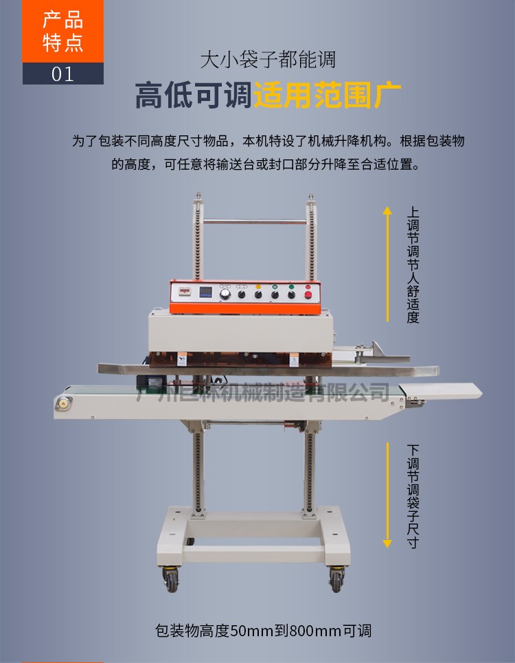本機適用于任何以熱封材料的封口。速度無級可調,恒溫控制,溫度可調,輸送臺高低可調,適應范圍極廣泛。